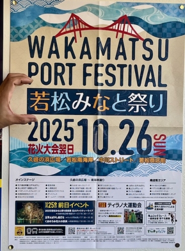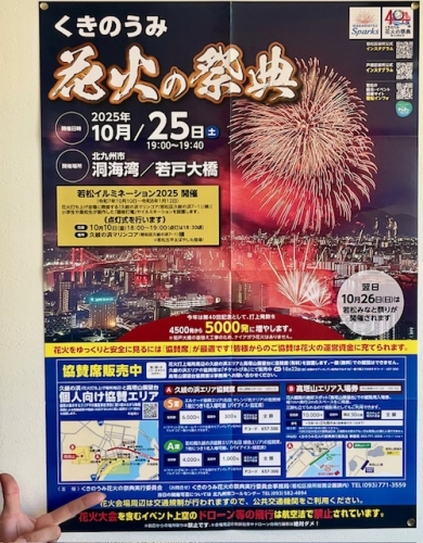 今年もずっと応援して来た「くきのうみ花火の祭典」が 10月25日(土)に開催されます。 今年は記念すべき第40回ということで、例年よりもさらにパワーアップ! 打上発数が去年の4500発から5000発に! 洞海湾と若戸大橋を背景に、迫力満点の花火が打ち上げられます。 花火大会翌日は、「若松みなとまつり」も開催予定です。 記念すべき第40回、みんなで楽しみましょう!