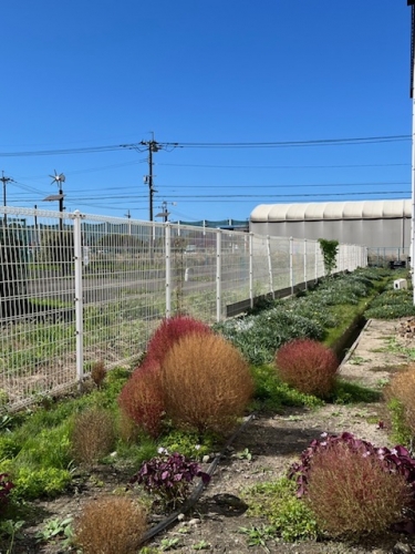 コキアが少しずつ赤く色づいています。 鮮やかな赤色が綺麗です。