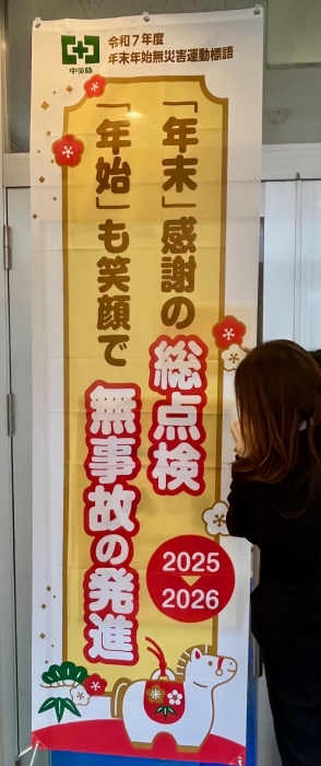 2025年 年末年始無災害運動のスローガンは 『「年末」感謝の総点検「年始」も笑顔で無事故の発進』です。 年末年始無災害運動は、働く人たちが年末年始を無事故で過ごし、 明るい新年を迎えることを目的とした取り組みです。 2025年度の運動は、2025年12月1日(月)~2026年1月15日(木) までの期間に行われます。 作業前点検や安全な作業方法の確認をし、安全意識を高めましょう。