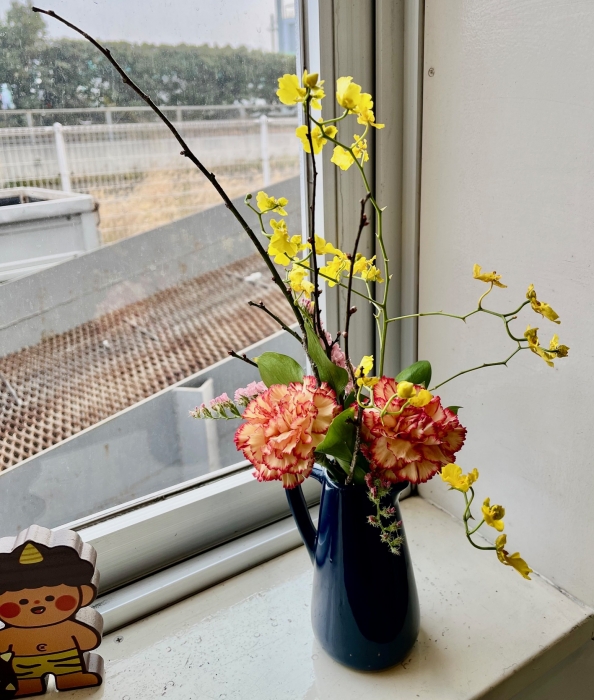 お正月用のアレンジのお花が、まだ元気です! 綺麗に残っているものを、小さくまとめて飾っています。 まだ蕾もあるので、もう少し楽しめそうです。