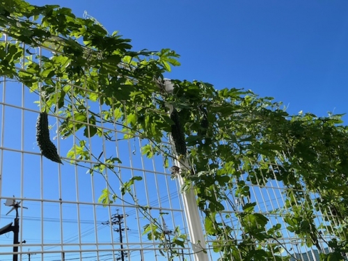 夏の間は、あまり育たなかったゴーヤが大きく育っています。 10月なのに・・・ 空が綺麗で、まるで夏のようです!