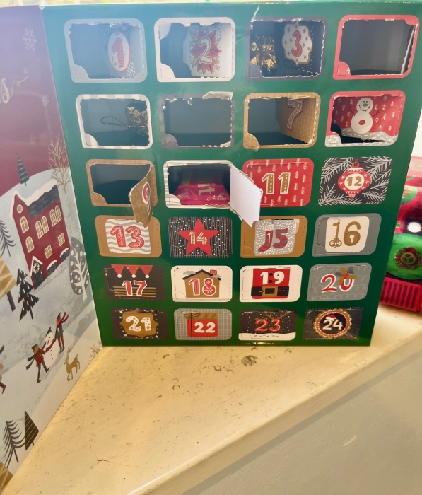 今年はアドベントカレンダーを飾りました。 クリスマスまでの期間、毎日ひとつずつ窓を開けていくカレンダーです。 窓の中には小さな飾りと、お菓子を入れています。 すべての窓を開け終わると、クリスマス当日です。 クリスマスまで毎日楽しみです。