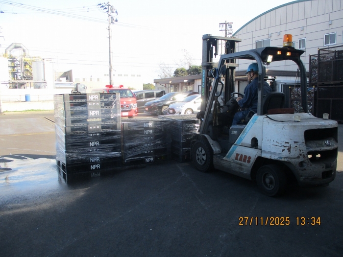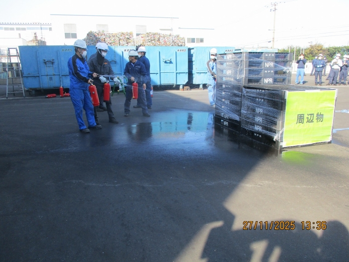 防災訓練を実施しました。 「火事だ!」の声で開始です。 火元場所に水消火器を使って消火活動を行いました。 同時に延焼防止のため、周辺可燃物をフォークリフトで除去し、 消防署員へ報告して終了です。 訓練結果 ・具体的に何が燃えているか伝える ・消火器の使い方をもう1度確認する ・人数確認で、取り残された人がいたら消防署員に伝える ・火災が起こったら最小限におさえる事が大事